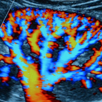Ultrassom que mapeia o fluxo sanguíneo em cores, avaliando direção e velocidade do sangue em artérias e veias para diagnóstico vascular preciso.