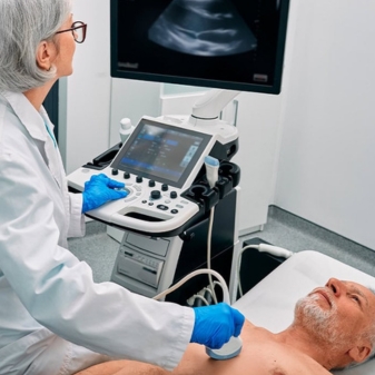 Ultrassom com Doppler que avalia estrutura e fluxo do coração em tempo real, indispensável para diagnóstico e monitoramento cardiológico.