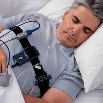 Registra padrões de sono (respiração, oxigenação e movimentos) para detectar distúrbios do sono.
