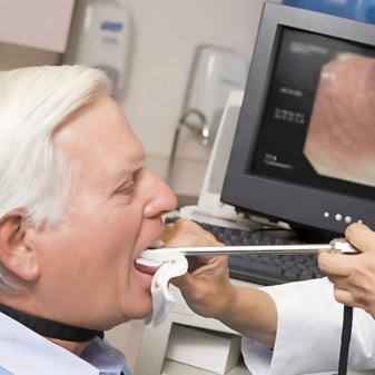 Iluminação estroboscópica para observar movimento das pregas vocais e avaliar distúrbios da voz.